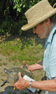 BLCT diamondback terrapin expert Charlotte Sornborger has been tracking the annual terrapin nesting at the Doug Rayner Wildlife Sanctuary at Nockum Hill from May through July for 23 years. About 370 females have been recorded over the years. Charlotte and a team of volunteers assist with the logging of information and protection of eggs until they hatch in August.